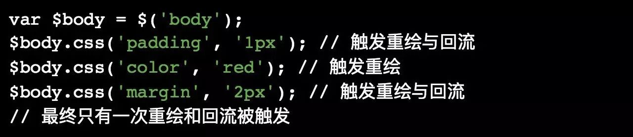 另外一项优化的技术则是在JavaScript代码运行时,浏览器会缓存所有的变化,然后只通过一次pass绘制操作来应用这些更改。例如下面这段代码只会触发一次重绘和回流: